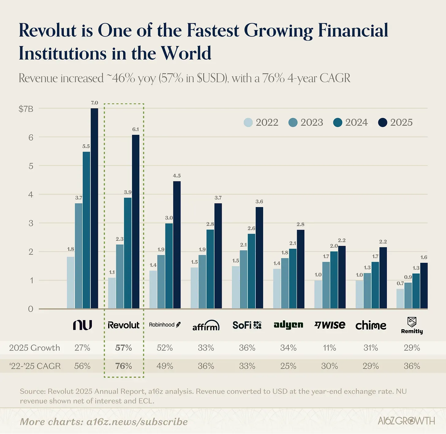 Alongside Nu, it sits in a category of its own within consumer fintech. Since crossing $1B in revenue in 2022, Revolut has compounded at ~76% CAGR (70% in GBP) over four years—rare growth at that scale. This is happening in Europe, a mature banking market, not an emerging one.