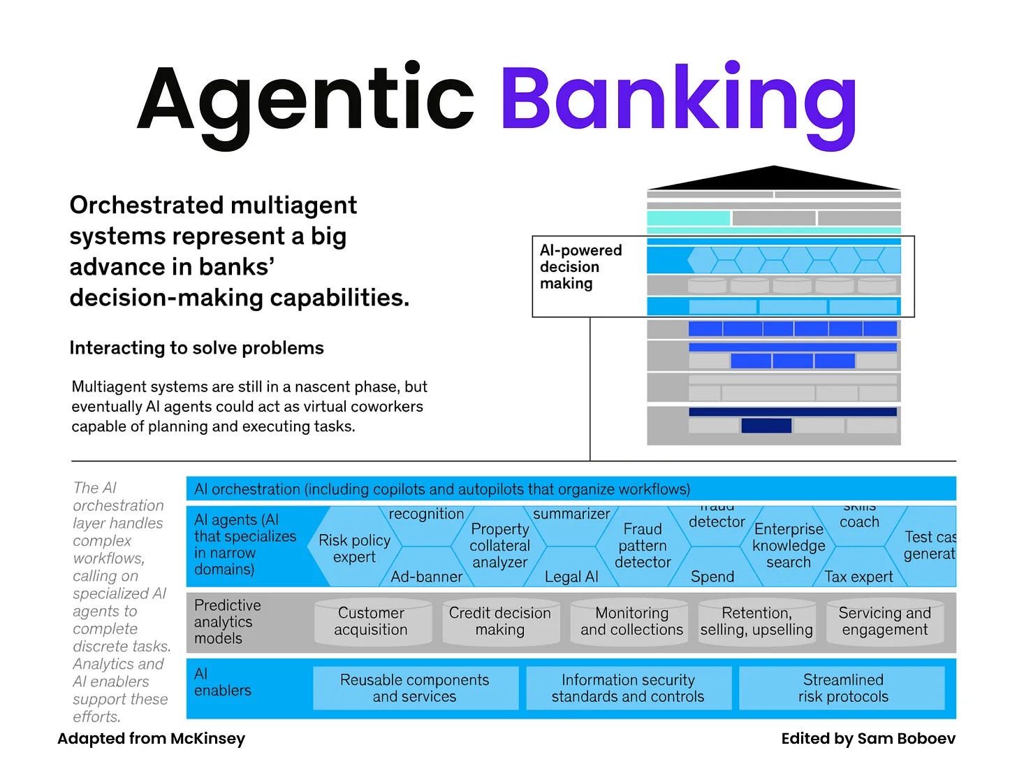 While still early and not yet ready for large-scale enterprise deployment, multiagent systems are gaining attention due to their potential. When combined with predictive models and digital tools, they could reshape core banking domains, driving productivity gains and enabling more engaging customer and employee experiences.