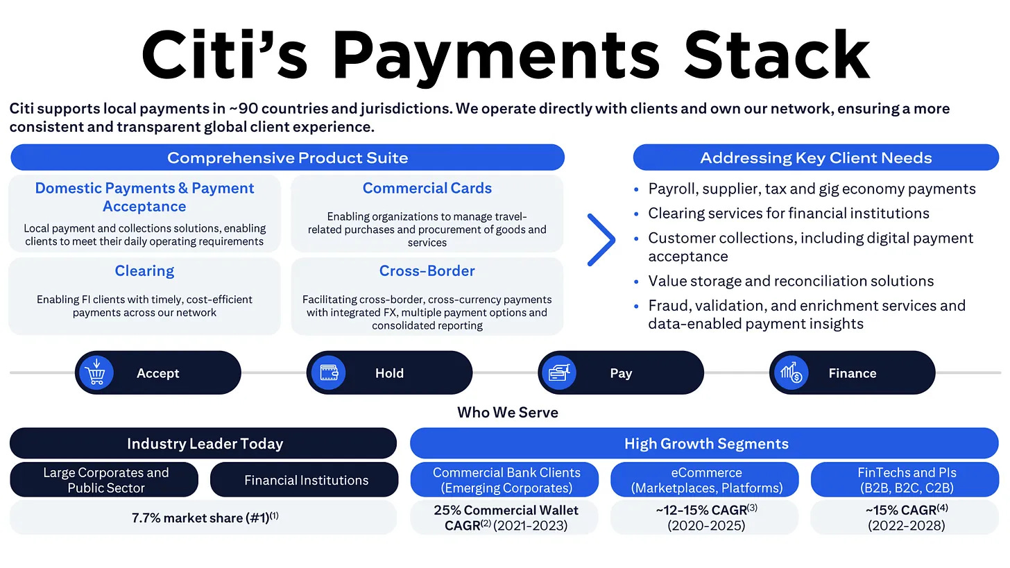 Citi’s thesis is to double down on this momentum by meeting clients’ evolving needs across every leg of a payment’s journey. That journey spans accepting payments, holding liquidity, paying out, and financing transactions. Citi’s strategy explicitly breaks this into “Accept, Hold, Pay, Finance,” ensuring the bank has offerings at each step. The underlying bet: if Citi can embed itself at each link in the chain from checkout to treasury to disbursement, and FX clients will find it compelling to consolidate their flows through Citi’s ecosystem. And with the global footprint already in place, Citi can capture the worldwide shift to electronic payments, e-commerce, and instant funds movement at scale.