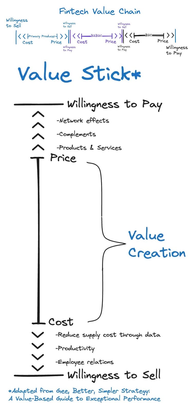 At the top of the stick is the user’s willingness to pay (WTP) — the maximum amount they’re willing to spend on a product or service. At the bottom is the willingness to sell (WTS) of suppliers, employees, and investors — essentially, the costs of providing that service.
