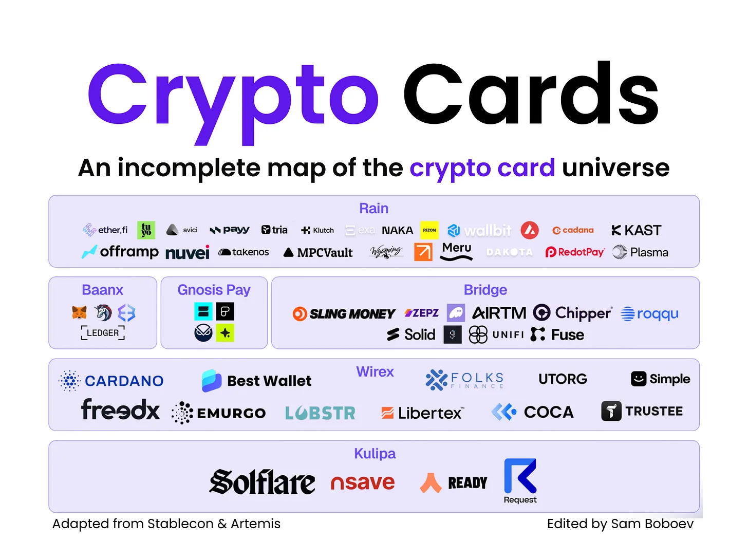 You have infrastructure players like Rain and Bridge sitting alongside program managers like Baanx and Gnosis Pay. You have wallets, onramps, settlement layers, and regional issuers. Cardano-native initiatives appear next to multi-chain stacks. Kulipa and others focus on enabling issuance-as-a-service.