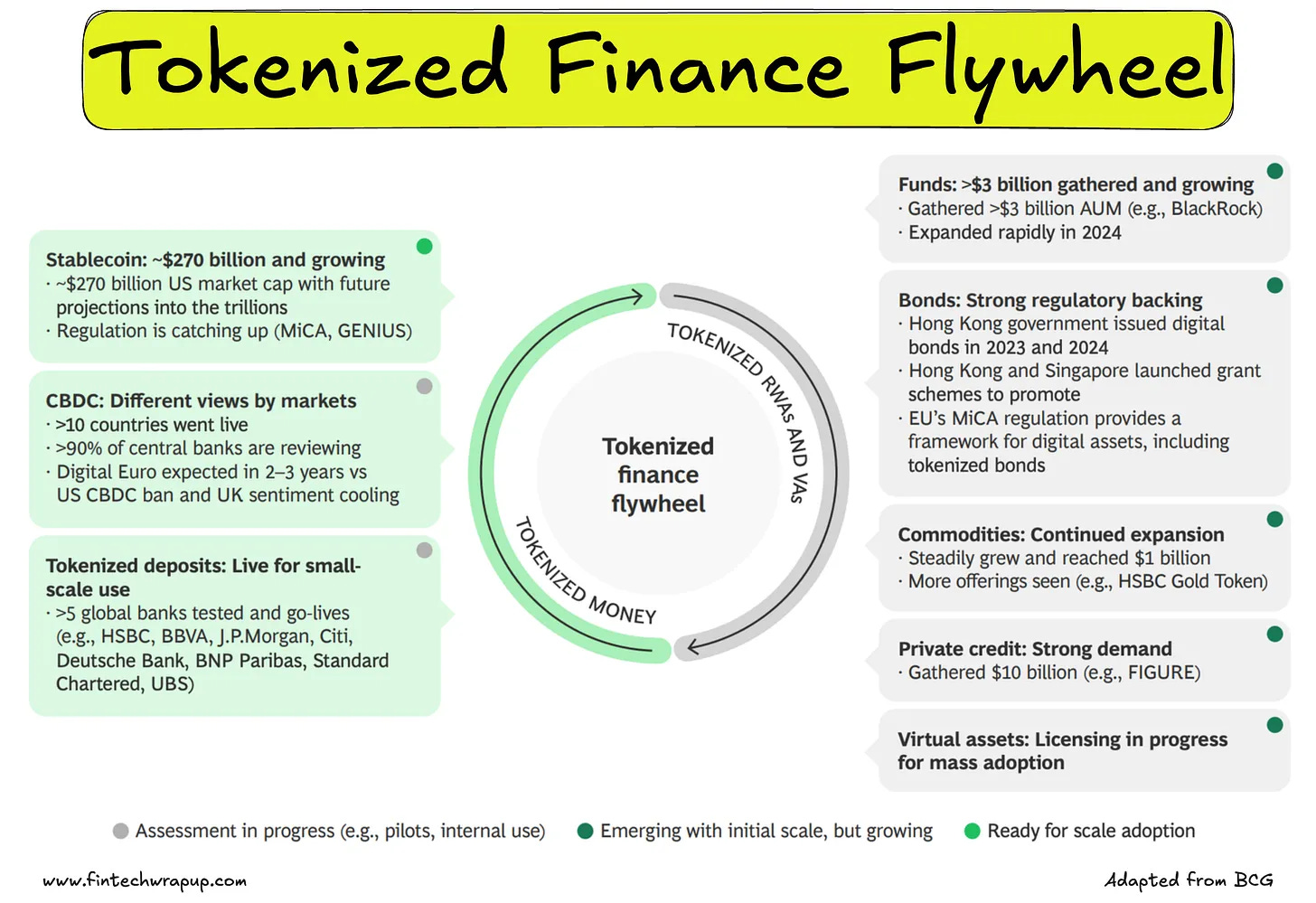 As tokenized money gains ground, the flywheel turns toward tokenized real-world assets (RWAs) and virtual assets (VAs) — bringing liquidity, transparency, and programmability to everything from bonds to private credit.