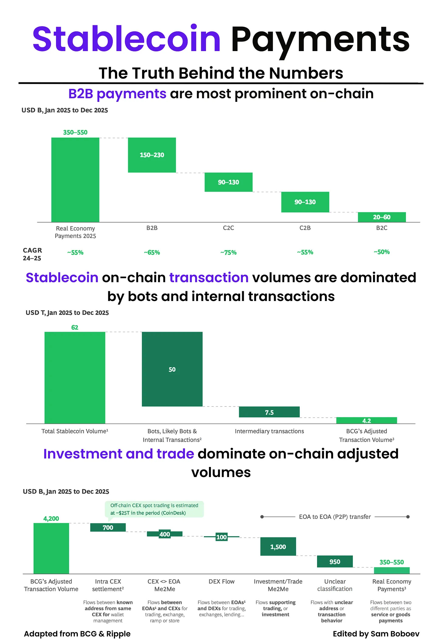 Out of roughly $62 trillion in gross stablecoin transfer volume in 2025, only $4.2 trillion remains after removing non-economic activity. That is the base for BCG’s analysis.