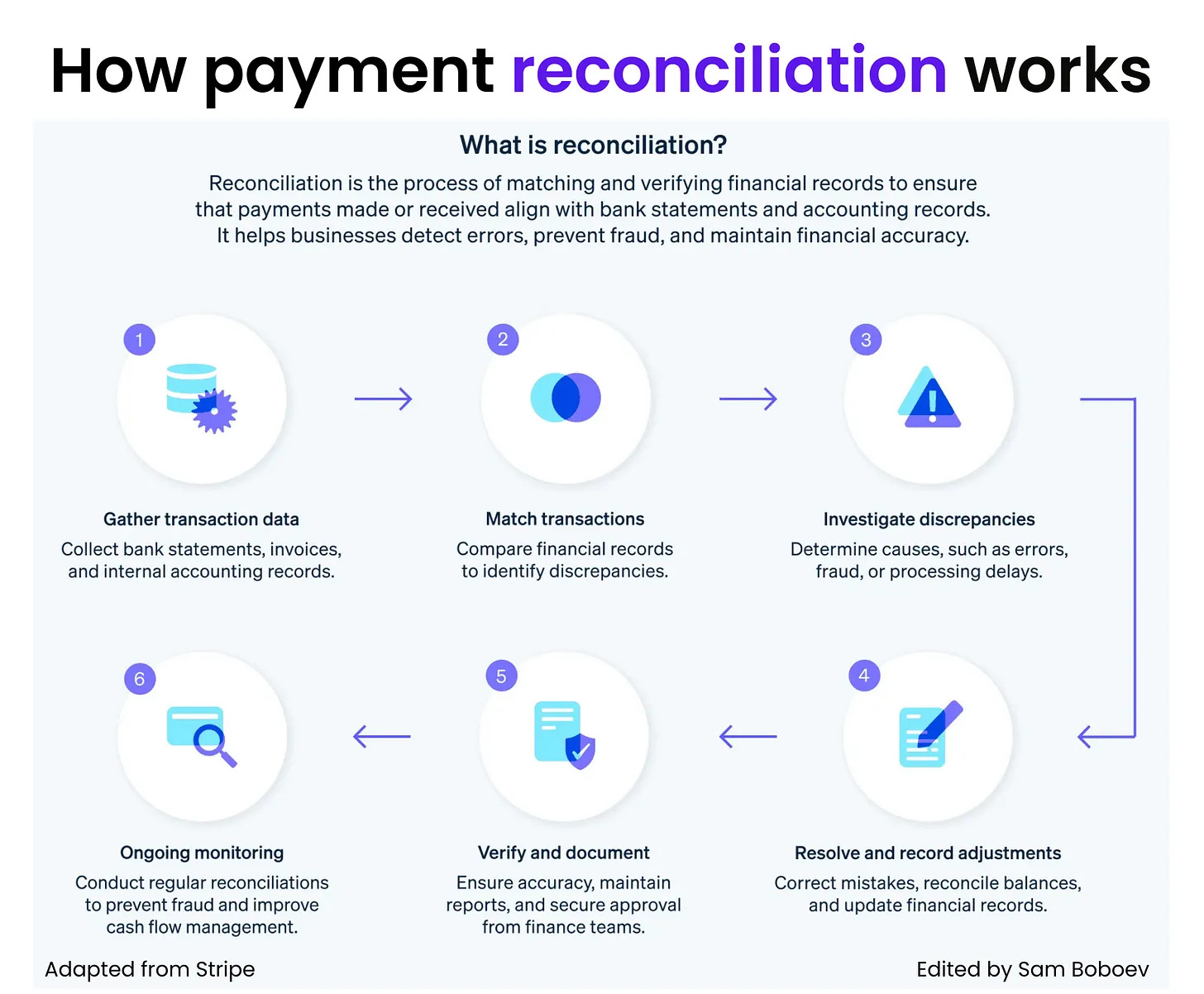 Payment reconciliation involves several steps that help ensure the payments recorded in the financial statements are consistent with the payments made or received. The exact process varies from business to business, but generally includes the following steps: