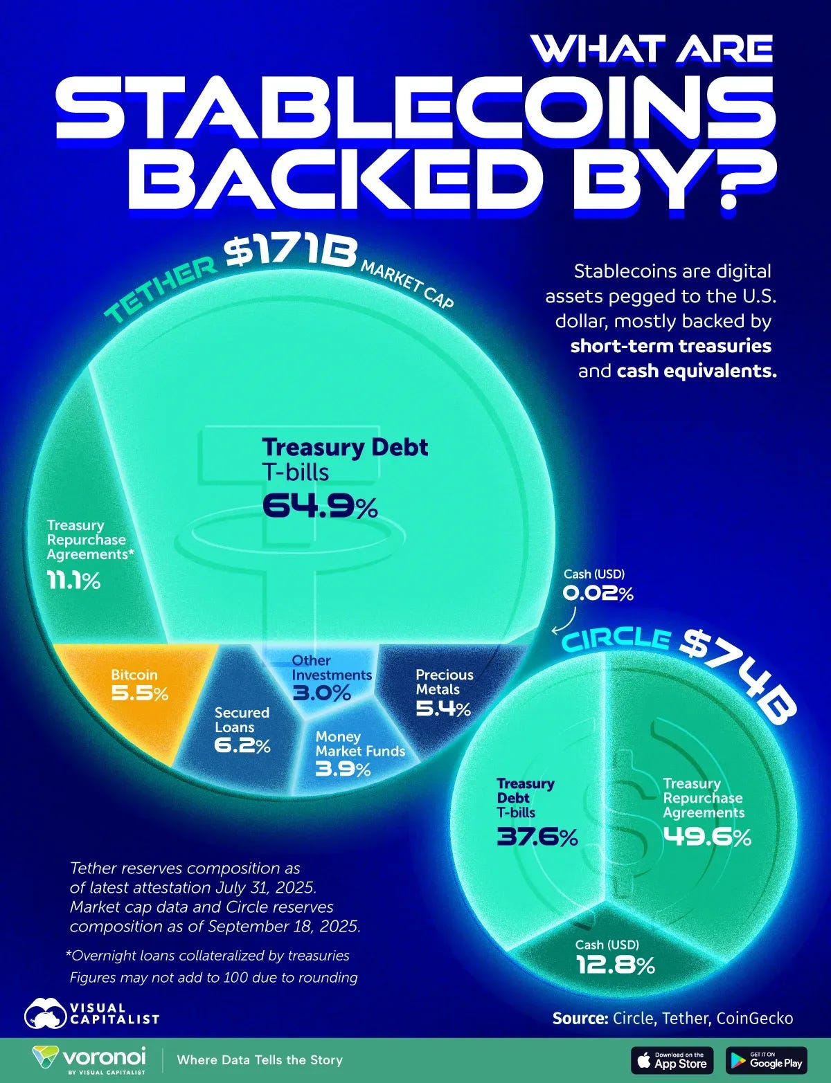 Tether leads with a $171B market cap, while Circle’s USDC follows at $74B. Both are pegged 1:1 to the U.S. dollar — but their backing structures tell two different stories about how “stability” is managed in crypto.