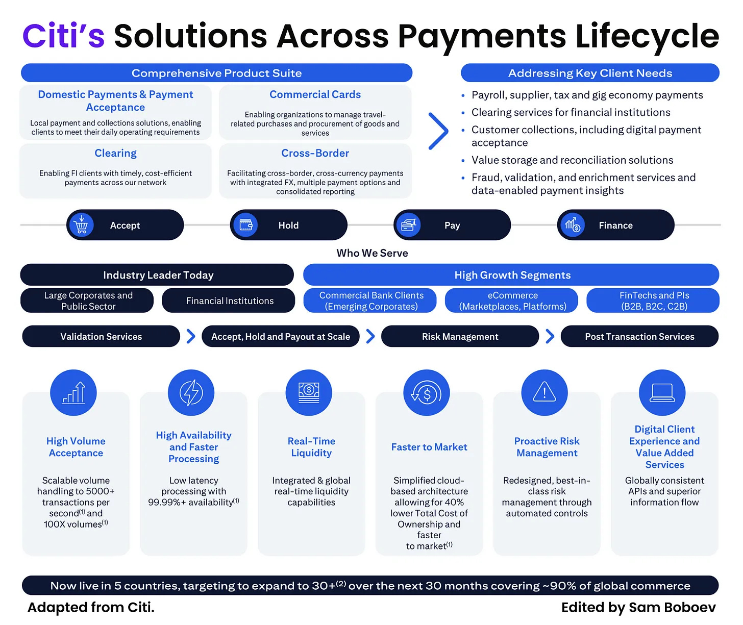 When you look closely at Citi Payments, you see a tightly integrated stack that spans Accept → Hold → Pay → Finance, all within one global network.