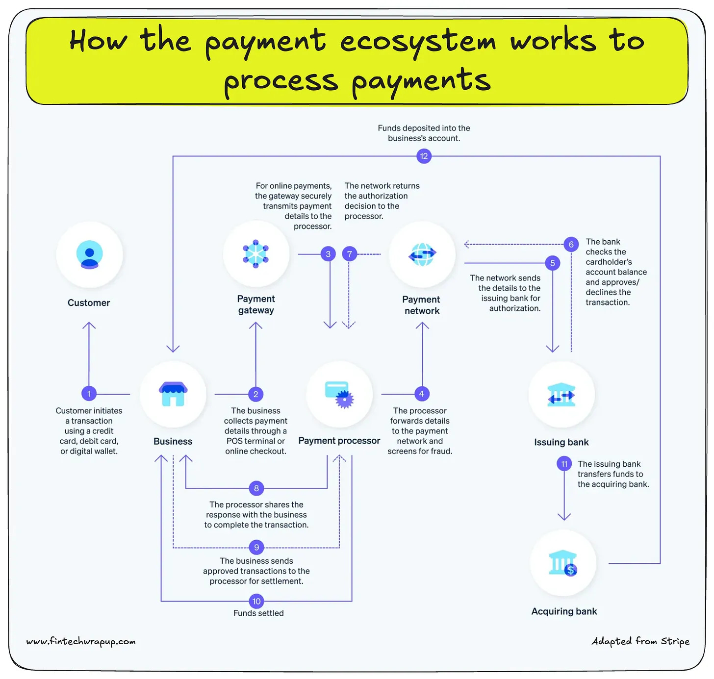 The payment processing ecosystem is a complex web of relationships between players who work together to enable seamless and secure transactions. As the term “ecosystem” suggests, there are interconnected relationships and functions at play. Here’s an overview of how these stakeholders interact during payment processing: